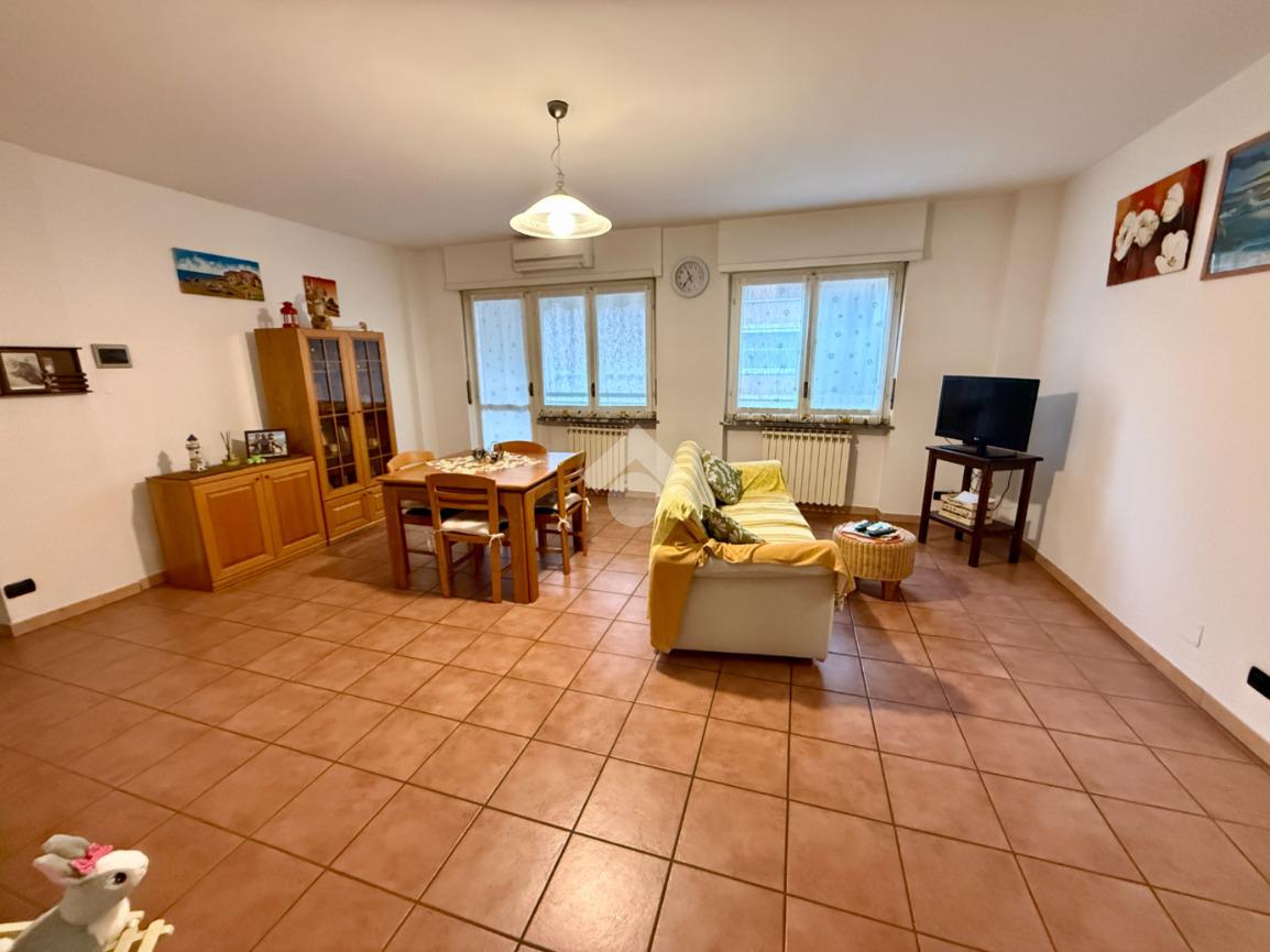 L’ingresso si apre su un luminoso soggiorno con angolo cottura, ambiente di ottima metratura, potenzialmente divisibile per ricavare due locali abitabili, nel caso si volesse la cucina abitabile separata.