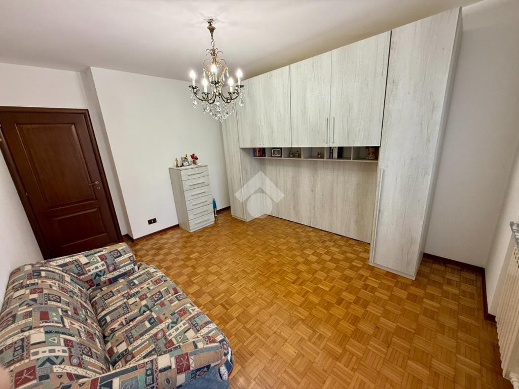 Un disimpegno suddivide la camera matrimoniale dotata anch'essa di balcone, dal ripostiglio e dal bagno con vasca.
